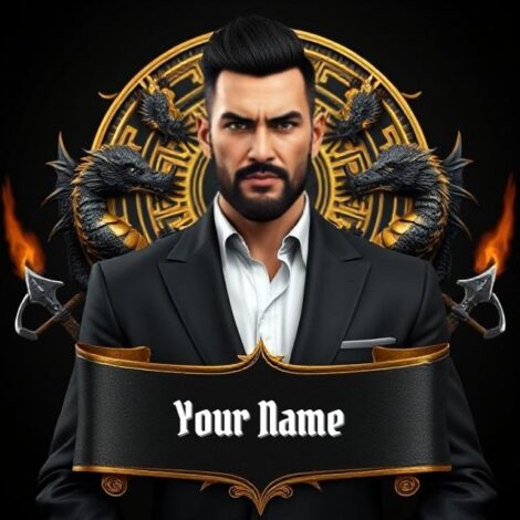 لو عايز تعيش جو القوة والخيال، جرب استبدال وشك على صورة الشاب اللى لابس بدلة سودة واقف قدام شعار فيه تنينين و فؤوس دهب. وارفع صورتك وخلى الذكاء الاصطناعى يركب وشك أوتوماتيك، وكمان تقدر تكتب اسمك على البانر الأسود اللى تحت. جرب دلوقتى استبدال الوجه، الذكاء الاصطناعى، تركيب الوجوه، اضافة الاسم.