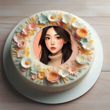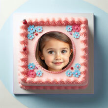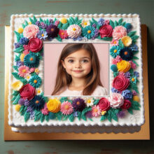 يا أصحاب القلوب الحلوة! الحقوا شوفوا التورتة اللي كلها بهجة دي! إضافة صورة على تورتة عيد ميلاد عمرها ما كانت بالجمال ده. التورتة لونها بينك رقيق، وعليها إطار صورة لتورتة عيد ميلاد شكله مربع ومزين، جواه صورة البنت القمر دي بابتسامتها الحلوة. والتورتة متزينة من فوق بأشكال كتير حلوة زي القلوب البينك والنجوم البيضاء وكمان فيه قوس قزح صغير وملون محطوط فوق الصورة، مديها شكل طفولي ومفرح. فكرة إضافة صورة على تورتة عيد ميلاد مع الألوان المبهجة دي بتخلي التورتة مش مجرد حلو، دي بتبقى قطعة فنية بتفرح العين والقلب. لو نفسك تعمل إطار صورة لتورتة عيد ميلاد بالألوان الحلوة دي، دلوقتي الأونلاين سهّل كل حاجة، وبتقدر تختار التصميم اللي يعجبك وتحط صورتك أو صورة حد بتحبه، وتفرحوا بيها في عيد الميلاد أو أي مناسبة سعيدة.