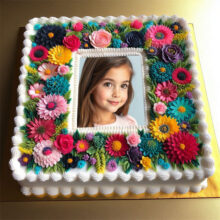 يا عشاق الرومانسية والألوان الدافئة! الحقوا شوفوا التورتة اللي كلها مشاعر حلوة دي! إضافة صورة على تورتة عيد ميلاد عمرها ما كانت بالجمال ده. التورتة لونها أحمر كلها حب، وعليها إطار صورة لتورتة عيد ميلاد شكله دايرة بسيطة، جواه صورة البنوتة القمر دي بابتسامتها اللي بتنور الدنيا. والتورتة متزينة من فوق بوردات بيضاء ناعمة، وكل وردة عليها قلب أحمر صغير وبارز، مديها شكل رومانسي ولطيف يجنن. وكمان فيه ورد أحمر صغير ملفوف بشكل فني على جوانب التورتة، بيديها شكل متكامل ومليان بالحب. فكرة إضافة صورة على تورتة عيد ميلاد مع القلوب والورد ده بتخلي التورتة مش مجرد حلو، دي بتبقى تعبير عن المشاعر الجميلة والمحبة. لو نفسك تعمل إطار صورة لتورتة عيد ميلاد بالجمال ده، دلوقتي الأونلاين سهّل كل حاجة، وبتقدر تختار التصميم اللي يعجبك وتحط صورتك أو صورة حد بتحبه، وتفرحوا بيها في عيد الميلاد أو أي مناسبة فيها احتفال بالحب والمودة.