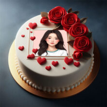 ضع صورتك على تورتة عيد ميلاد حمراء بقلوب وورد أبيض