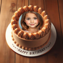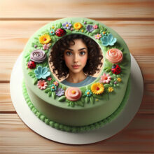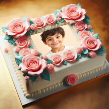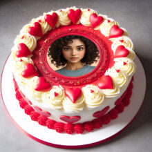 يا عشاق الورد والجمال! الحقوا شوفوا التورتة اللي كلها رومانسية دي! إضافة صورة على تورتة عيد ميلاد عمرها ما كانت بالرقة دي. التورتة لونها أحمر مخملي جذاب، وعليها إطار صورة لتورتة عيد ميلاد شكله دايرة بسيطة وأنيقة، جواه صورة البنت الجميلة دي بعيونها الواسعة. التورتة متزينة من فوق بورد أحمر كبير وبارز، وكمان ورد أبيض صغير ملفوف بشكل رقيق، مديها شكل رومانسي وهادي يجنن. فكرة إضافة صورة على تورتة عيد ميلاد مع الورد بتخلي التورتة مش مجرد حلو، دي بتبقى تعبير عن الحب والمشاعر الجميلة. لو نفسك تعمل إطار صورة لتورتة عيد ميلاد بالجمال ده، دلوقتي الأونلاين سهّل كل حاجة، وبتقدر تختار التصميم اللي يعجبك وتحط صورتك أو صورة حد بتحبه، وتفرحوا بيها في عيد الميلاد أو أي مناسبة فيها احتفال بالحب.
