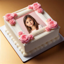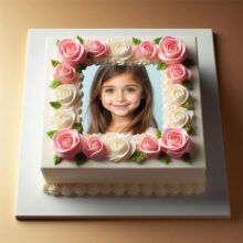 يا محبي الورد والجمال الهادي! الحقوا شوفوا التورتة اللي كلها رقة وشياكة دي! إضافة صورة على تورتة عيد ميلاد عمرها ما كانت بالنعومة دي. التورتة شكلها دايرة أنيقة، وعليها إطار صورة لتورتة عيد ميلاد شكله دايرة بسيط، جواه صورة البنوتة القمر دي بابتسامتها اللي بتنور الدنيا. والتورتة متزينة من فوق بورد بينك كبير ملفوف بشكل جميل، وبين كل وردة فيه ورد أبيض صغير وأوراق خضرا رقيقة، مديها شكل طبيعي وهادي يجنن. وكمان فيه ورد بينك وأبيض صغير متوزع بشكل فني حوالين الصورة، مديها شكل متكامل ورقيق. فكرة إضافة صورة على تورتة عيد ميلاد مع الورد الناعم ده بتخلي التورتة مش مجرد حلو، دي بتبقى تعبير عن الرقة والجمال. لو نفسك تعمل إطار صورة لتورتة عيد ميلاد بالجمال ده، دلوقتي الأونلاين سهّل كل حاجة، وبتقدر تختار التصميم اللي يعجبك وتحط صورتك أو صورة حد بتحبه، وتفرحوا بيها في عيد الميلاد أو أي مناسبة فيها احتفال بالجمال الطبيعي.