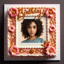 يا محبي الألوان الهادية والجمال البسيط! الحقوا شوفوا التورتة اللي كلها رقة دي! إضافة صورة على تورتة عيد ميلاد عمرها ما كانت بالنعومة دي. التورتة شكلها دايرة أنيقة، وعليها إطار صورة لتورتة عيد ميلاد شكله مربع بسيط، جواه صورة البنوتة القمر دي بابتسامتها الحلوة وعيونها الجميلة. والتورتة متزينة من فوق بورد صغير بينك وأبيض متوزع بشكل جميل، وبين كل وردة فيه ورقة خضرا صغيرة منعشة، مديها شكل طبيعي وهادي يجنن. وكمان فيه طبقة من الكريمة البينك المكشكشة حوالين قاعدة التورتة، مديها شكل مميز ورقيق. فكرة إضافة صورة على تورتة عيد ميلاد مع الورد الصغير ده بتخلي التورتة مش مجرد حلو، دي بتبقى تعبير عن الرقة والجمال البسيط. لو نفسك تعمل إطار صورة لتورتة عيد ميلاد بالجمال ده، دلوقتي الأونلاين سهّل كل حاجة، وبتقدر تختار التصميم اللي يعجبك وتحط صورتك أو صورة حد بتحبه، وتفرحوا بيها في عيد الميلاد أو أي مناسبة سعيدة.