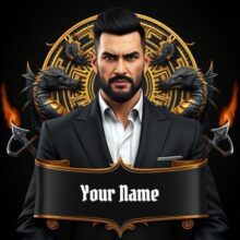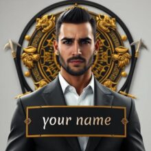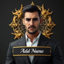 جرب تحط وشك واسمك على صورة الراجل اللى لابس بدلة أنيقة قدام خلفية سودة وعليها وسام دهبى، ومعاه لافتة فاضية…
