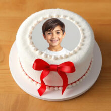ضع صورتك على تورتة عيد ميلاد بيضاء بفيونكة حمراء