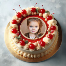ضع صورتك على تورتة عيد ميلاد حمراء بكرز وكريمة بيضاء
