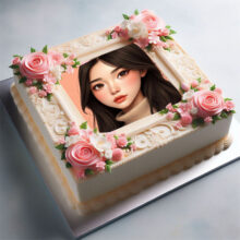ضع صورتك على تورتة عيد ميلاد مربعة بورد بينك وأبيض